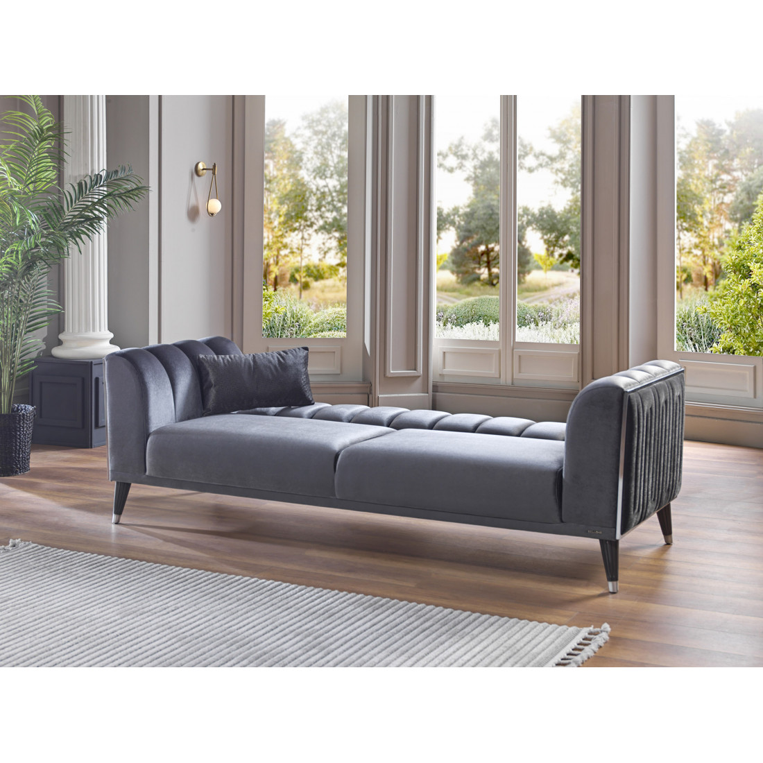 Трехместный диван-кровать Гравита (Gravita) GRAV-02 Беллона вместительный диван с невысокой спинкой. Габаритные размеры дивана 230х88х80см, позволяют трансформировать его в удобную кровать со спальным местом 106*182см. Диван на металлокаркасе, наполнение высококачественный турецкий ППУ. Вертикальная прострочка ткани боковин обрамлена хромированными вставками по периметру. Ножки дивана изготовлены из прочного ABS-пластика.