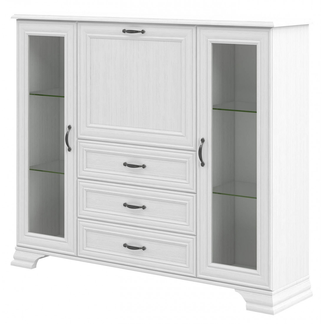 Тумба Юнона МН-132-19 от фабрики Мебель-Неман - универсальная тумба-витрина в классическом стиле с отделкой структурной фактуры, обрамленная рамочным фасадом, где металлические ручки выгодно подчёркивают стиль и изящество, всегда актуальна и востребована.